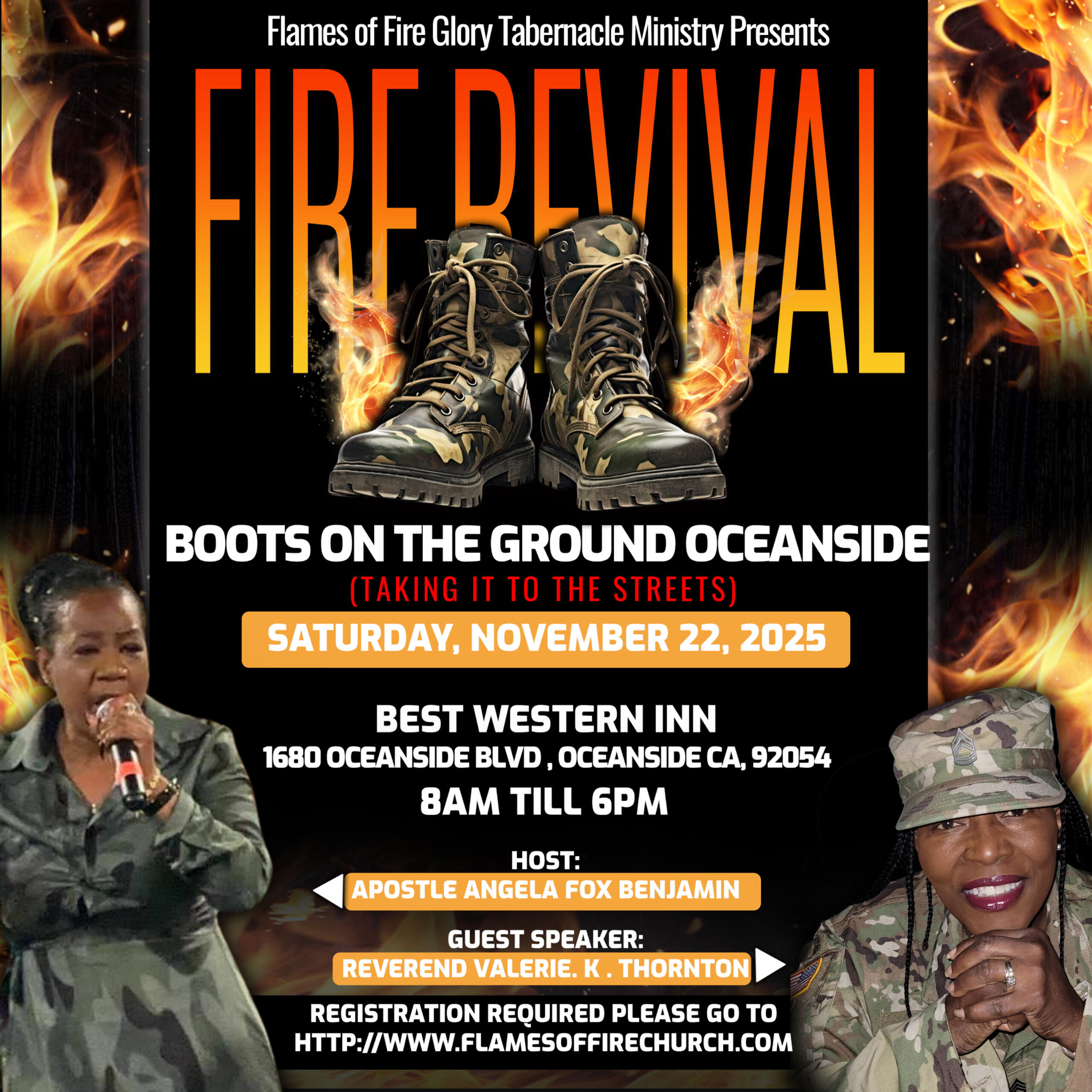 Flames of Fire Glory Tabernacle Church is a Spirit-led, kingdom-driven ministry located in the heart of Oceanside, California. Founded on the power of prayer and the presence of God, our mission is to equip believers to walk in authority, ignite revival, and impact the world through the gospel of Jesus Christ.We believe in the fivefold ministry, prophetic worship, and cultivating a space where the fire of God can fall. Whether you are new to faith or seeking a deeper encounter, there’s a place for you here.